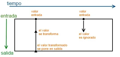 Cuando hablamos de reactive extensions es muy común encontrarnos con unos diagramas que nos ayudan a entender las operaciones. En ellos se muestra la evolución de la tarea de observación con respecto el tiempo y tienen este formato: