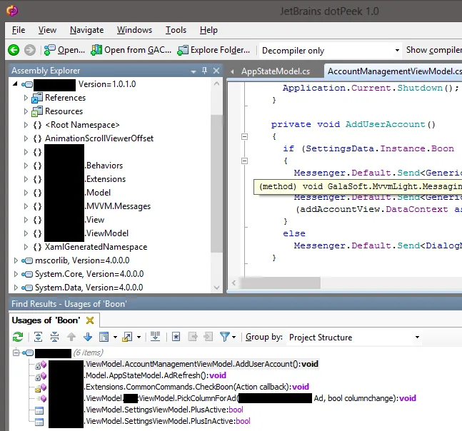A partir de este punto hemos decidido utilizar el dotPeek en lugar de Reflector, ya que trae una serie de herramientas de búsqueda y exploración que no trae (de serie) la anterior herramienta: