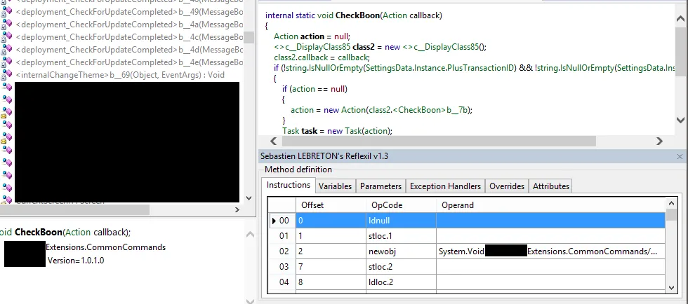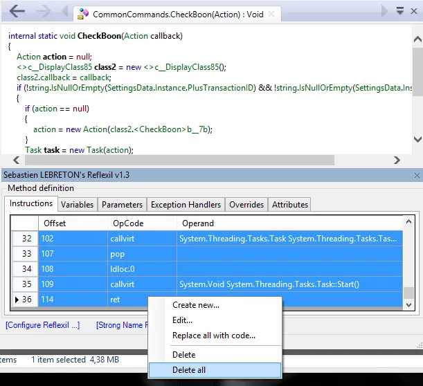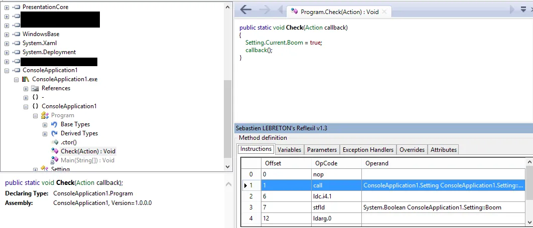 La forma más simple de conseguir el código IL que necesitamos es escribir una simulación en un proyecto nuevo de Visual Studio para así poder encontrar el código IL con el tándem Reflector+Reflexil: