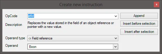 Además, otra de las ventajas de Reflexil es que nos facilita la tarea con una pequeña herramienta para creación de instrucciones de IL, con un buscador de operadores incluido:
