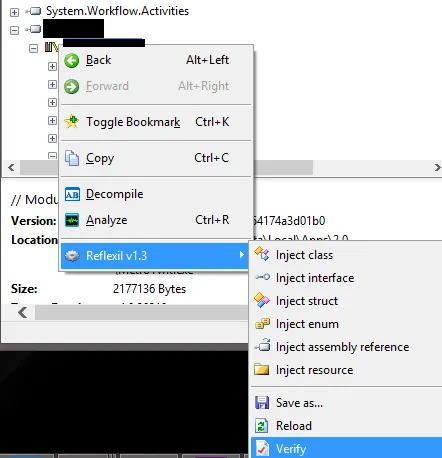 Entonces solo nos quedarán dos acciones, la primera verificar los cambios que hemos realizado dirigiéndonos al panel de nuestra izquierda y en las opciones del ejecutable buscando Reflexil -> Verify:
